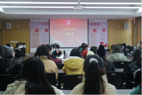 2022年12月2日下午,学校党委委员、宣传部长王春华同志在执治楼503会议室给马克思主义学院学生党员上《青春逢其时,奋斗正当时——党的二十大带给当代青年的发展良机》主题的党课。本次党课由学院党总支副书记袁婧老师主持,学生党支部书记、全体学生党员、辅导员参加党课学习。