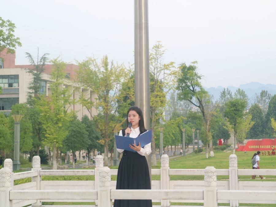 在活动现场,马克思主义学院梁佳慧同学作了国旗下的主题演讲“学习榜样精神,汲取奋进力量”。梁佳慧同学生动讲述了2011届优秀校友张郅昭逆行奔赴抢险救灾的英雄事迹。张郅昭毕业于思想政治教育专业,受益于遵义红色之城的熏陶,在灾难面前,以生命赴使命,勇毅担当、主动请缨到抢险救灾一线解救被洪水围困的职工群众,用行动践行共产党员的初心使命,用大爱诠释无悔人生,彰显遵师青年的大爱情怀。虽然张郅昭35岁的生命定格在了抢险救灾一线,但是他的先进事迹和崇高精神成为遵师全体思政人学习的榜样,成为遵师思政人勇担实现中华民族伟大复兴己任的伟大力量,激励遵师思政人不忘初心、勇敢前行,发扬艰苦奋斗、勇于开拓的精神,为国家繁荣富强与民族复兴贡献力量。