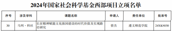 近日,全国哲学社会科学工作办公室公布2024年国家社会科学基金年度项目立项结果。我院曾杰教授喜获2024年国家社会科学基金西部项目立项,这是曾杰教授近年来的第二个国家社科基金项目。曾杰教授长期关注红色文化、长征精神,一直深耕这一领域,取得了丰硕的成果。此次获批立项,是对其前期研究的肯定。