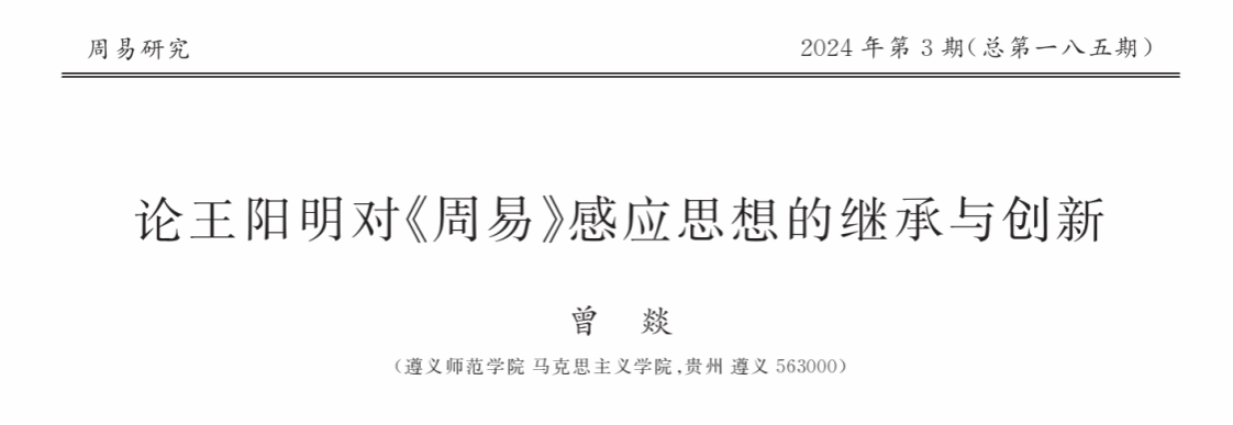 近日,我院年青教师曾燚博士在CSSCI期刊《周易研究》上发表了“论王阳明对《周易》感应思想的继承与创新”的理论文章,文章从感应的要素、感应的发生、感应的作用三个方面论述了阳明心学对《周易》感应思想的继承与创新。