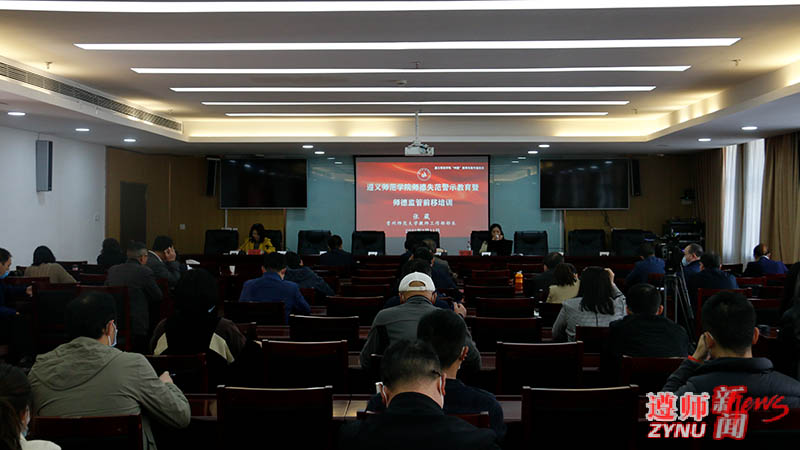 在行政楼214会议室,贵州师范大学教师工作部部长张葳向各二级学院分管师德师风负责人作了师德失范警示教育暨师德监管前移培训。