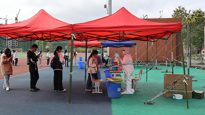 根据上级有关核酸抽检的要求,当天,学校组织了不少于5%的师生在东区运动场开展核酸检测。