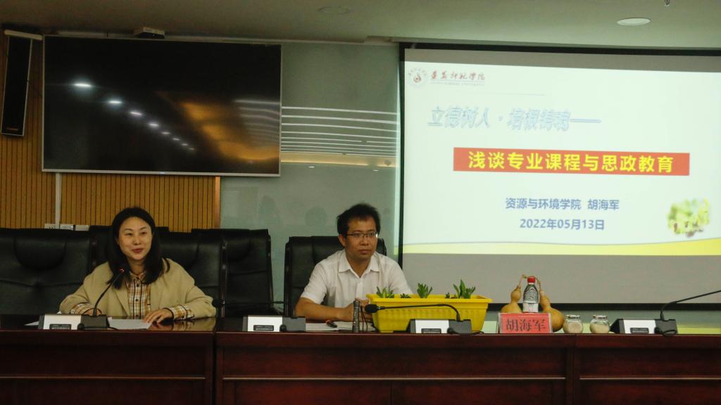 为深入贯彻学校师资队伍建设,提升教师发展水平,5月13日下午,beat365在行政楼214会议室举办第五期“树蕙”教师发展专题培训。全省首届“课程思政”教学大比武二等奖获得者、资源与环境学院副院长胡海军以《浅谈专业课程与思政教育》为题向各二级学院教师代表作培训。