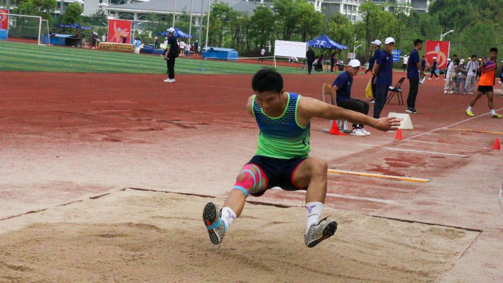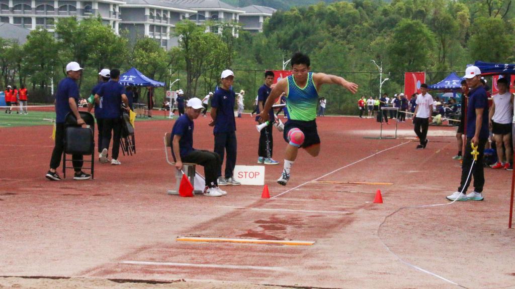 5月25日14时,男子三级跳远比赛开始。运动员们两臂摆开,两脚蹬地有力,努力去找自己的节奏和步点。经过激烈角逐,普通组男子方面,信息工程学院罗游游以12.02m的成绩夺得冠军,工学院冷开省、音乐与舞蹈学院董正宏分别获得亚、季军;专业组男子方面,冉红林以13.47m的成绩夺冠,姚人友、谭晓晓分别获得亚、季军。
