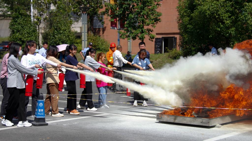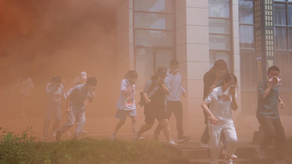 伴随警报声的响起,现场开始消防演练。在场师生在工作人员的指引下,用毛巾捂住口鼻,弯腰小跑,有序、迅速离开教学楼。到达安全区域后,在场师生在袁强的指导下,分组使用灭火器熄灭“火情”。