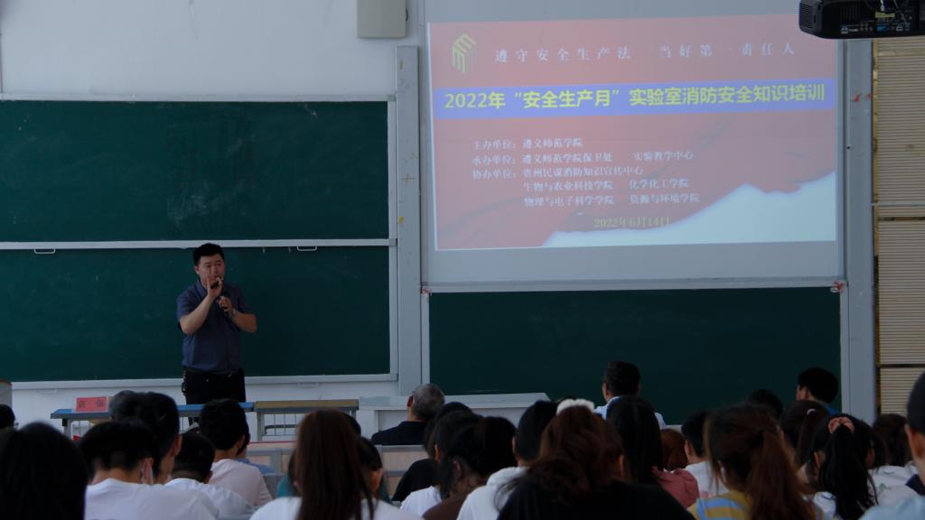 为提高beat365师生员工消防意识和应急技能,确保在发生火灾问题时能够高效有序的进行抢救、抢险以及救援处理,6月14日下午,贵州民谋消防知识宣传中心副主任、高级教官袁强对beat365师生开展实验室消防安全知识培训、应急疏散演练。