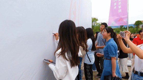 师生校友在工作人员的引导下有序排队,纷纷在签名墙上写下自己的名字,表达对学校的祝福。