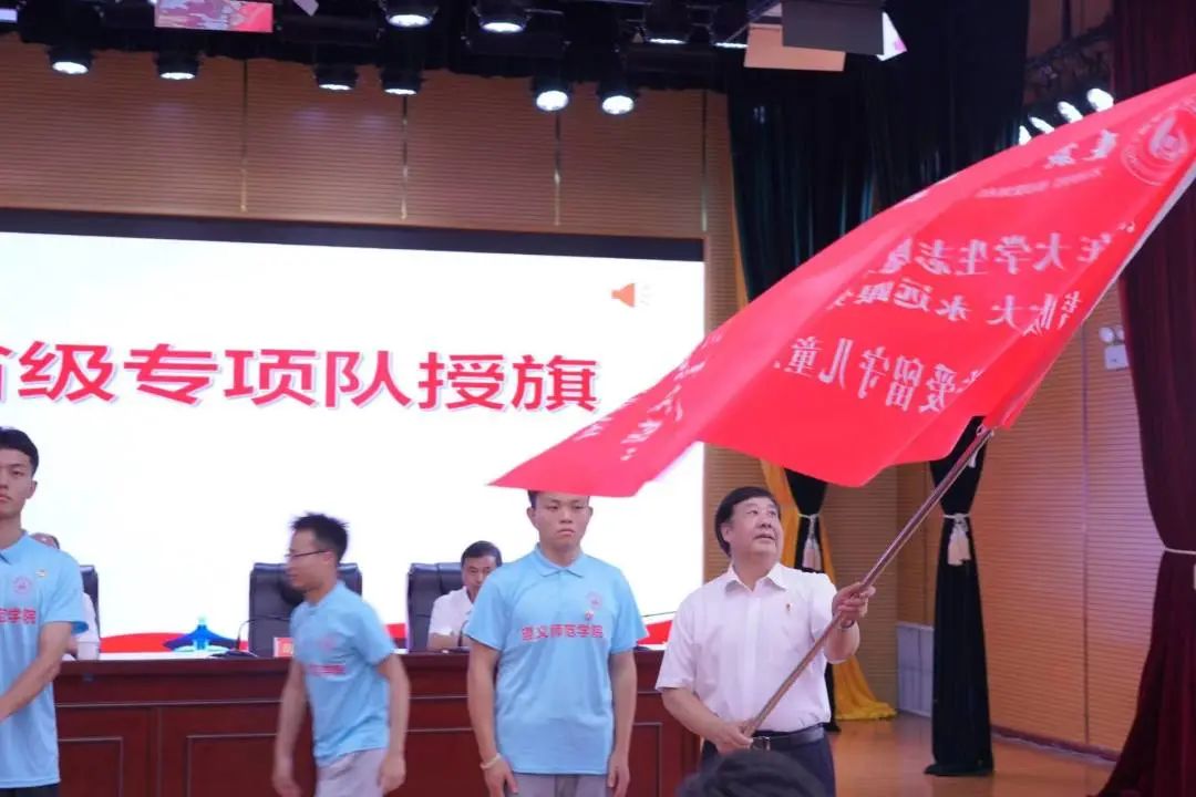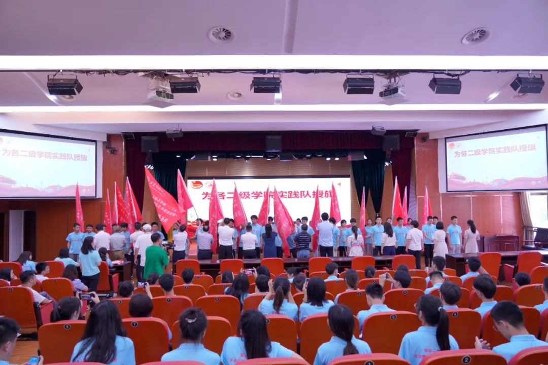 曾伯平、胡贵勇分别为“三下乡”国家级重点队和省级专项队授旗,各二级学院党委(党总支)副书记为二级学院“三下乡”实践服务队授旗。
