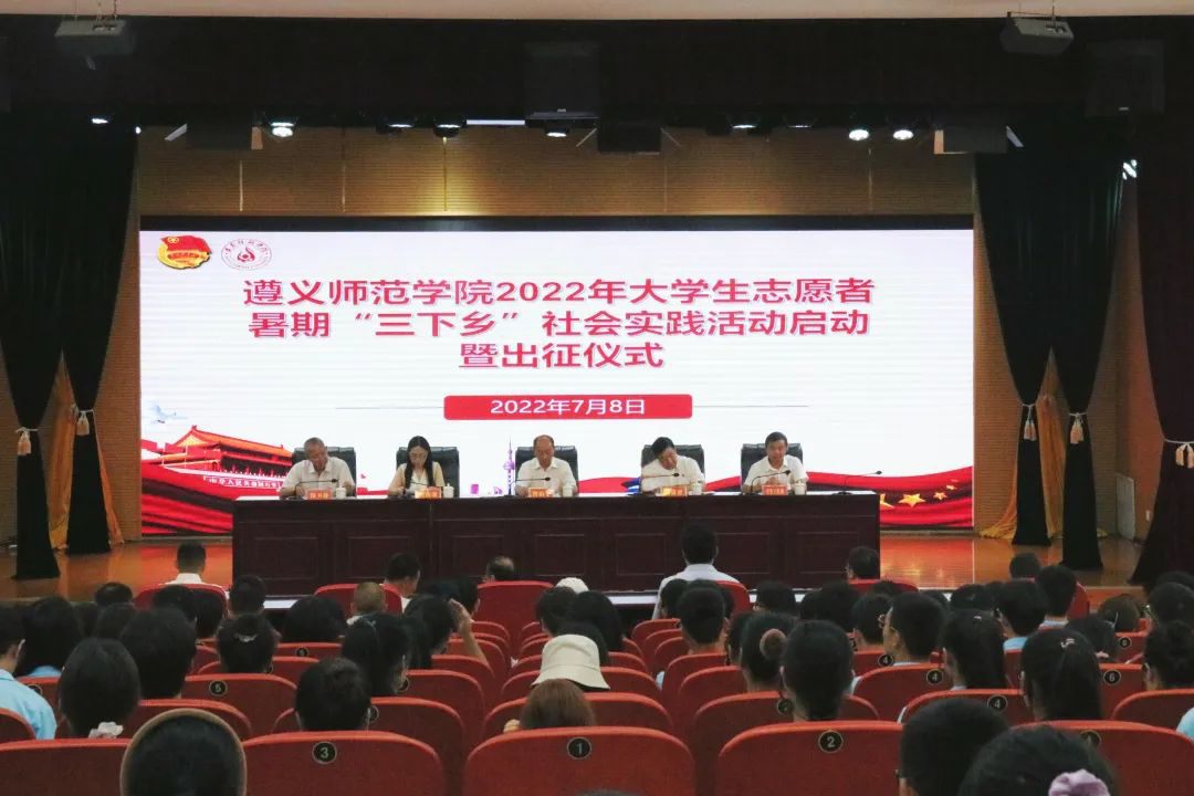 7月8日下午,beat365亚洲版官网2022年大学生志愿者暑期“三下乡”社会实践活动启动暨出征仪式在学术交流中心报告厅举行。党委副书记曾伯平,党委委员、副校长胡贵勇,党政办公室、党委宣传部、党委学生工作部、团委、保卫处、各二级学院有关负责人,实践服务队队员等参加仪式。仪式由党政办公室主任、团委书记付强主持。