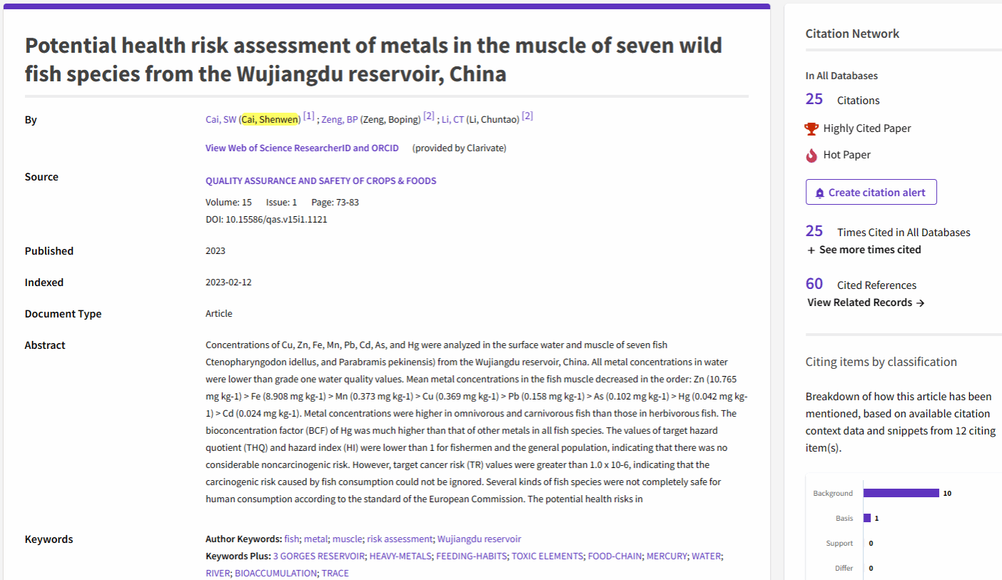 近日,根据科睿唯安公布的ESI(Essential Science Indicators)最新统计数据,资源与环境学院博士教师蔡深文作为第一作者在国际期刊Quality Assurance and Safety of Crops & Foods上发表的论文“Potential health risk assessment of metals in the muscle of seven wild fish species from the Wujiangdu reservoir, China”同时入选ESI全球Top 1%高被引论文(ESI Highly Cited Paper)和ESI全球Top 1‰热点论文(ESI Hot Paper)。该论文发表于2023年2月,beat365亚洲版官网(资源与环境学院)为第一署名单位。
