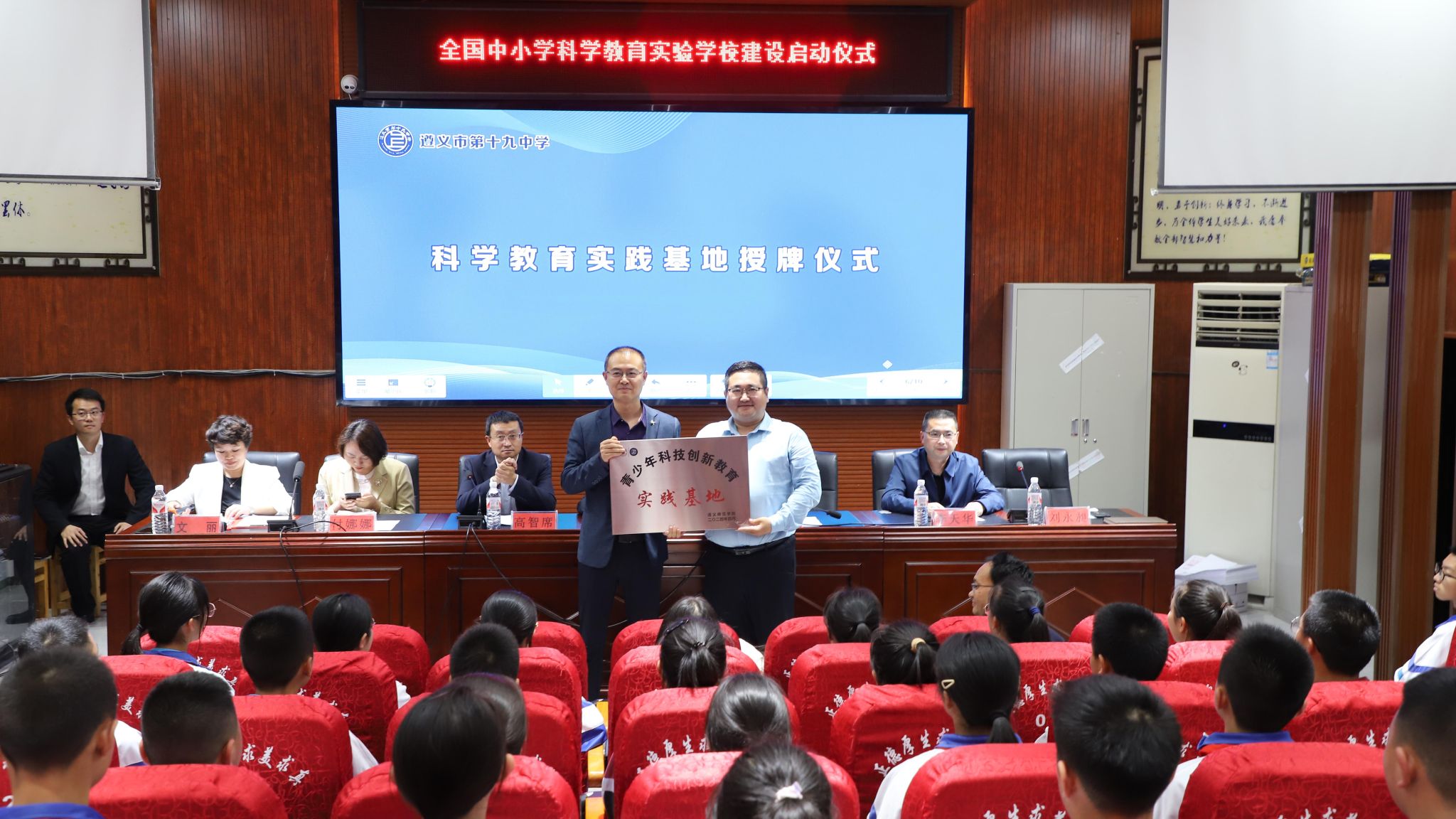 刘衍民代表beat365亚洲版官网授予遵义市第十九中学“beat365亚洲版官网青少年科技创新教育实践基地”牌匾,遵义市第十九中学校长刘永昶接受授牌。