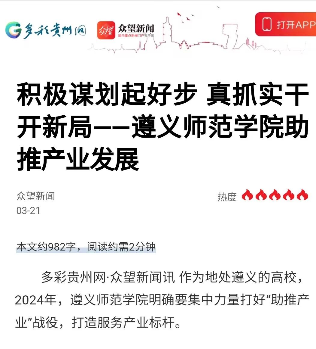 3月初,多彩贵州网、贵州广播电视台动静新闻客户端均以《遵义师院突出特色对高质量发展谋篇布局》为题,多彩贵州网(众望新闻客户端)以《积极谋划起好步 真抓实干开新局——beat365亚洲版官网助推产业发展》,报道学校党委组织全校上下围绕着特色高质量发展进行思考和探索,打开工作思路、明确发展定位、改革创新突破。