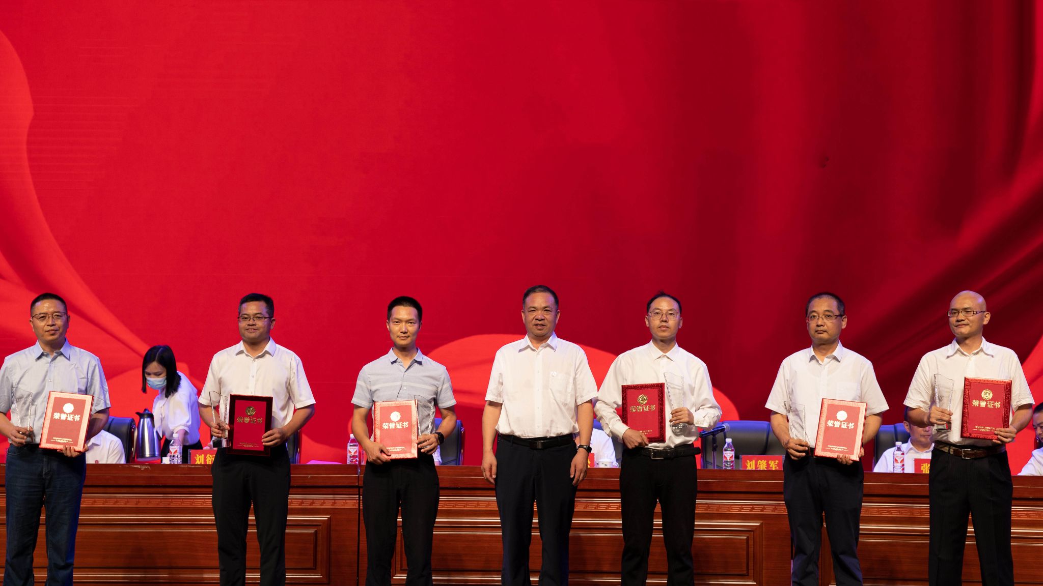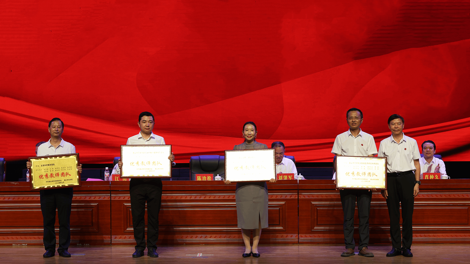 江山宣读《关于表彰beat365亚洲版官网2024年优秀个人和团队及三十年教龄教师的决定》后,主席台就座领导为学校2024年教学名师、优秀教师、青年教学标兵、优秀教育工作者、师德师风标兵、优秀科技工作者、优秀教师团队、三十年教龄教师颁奖。