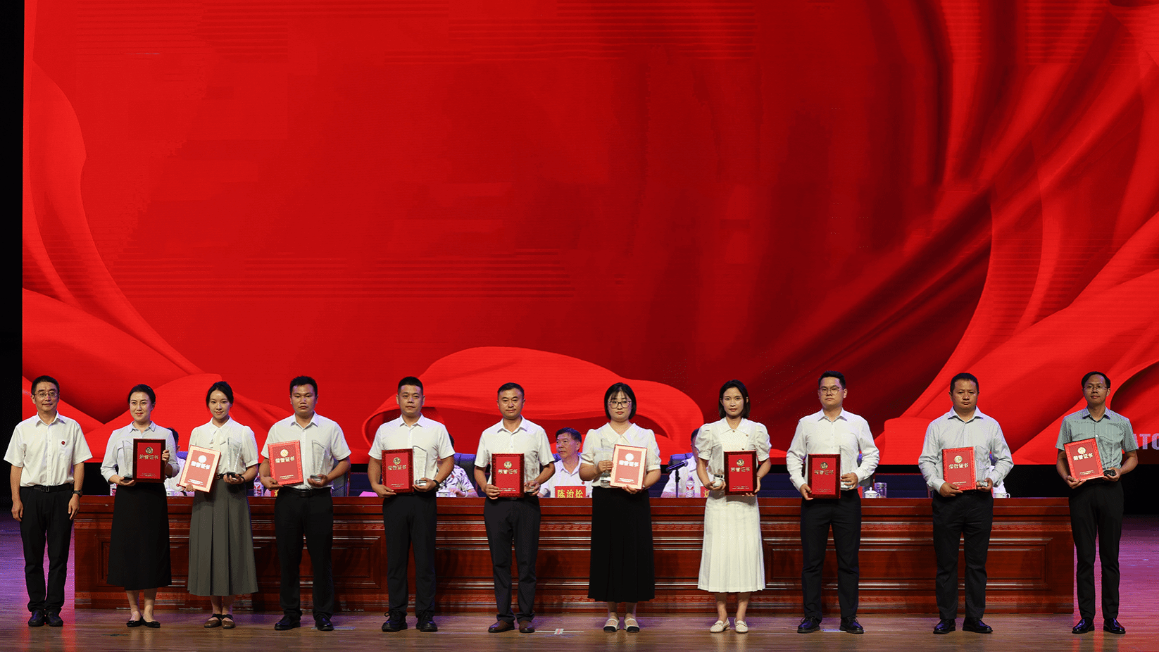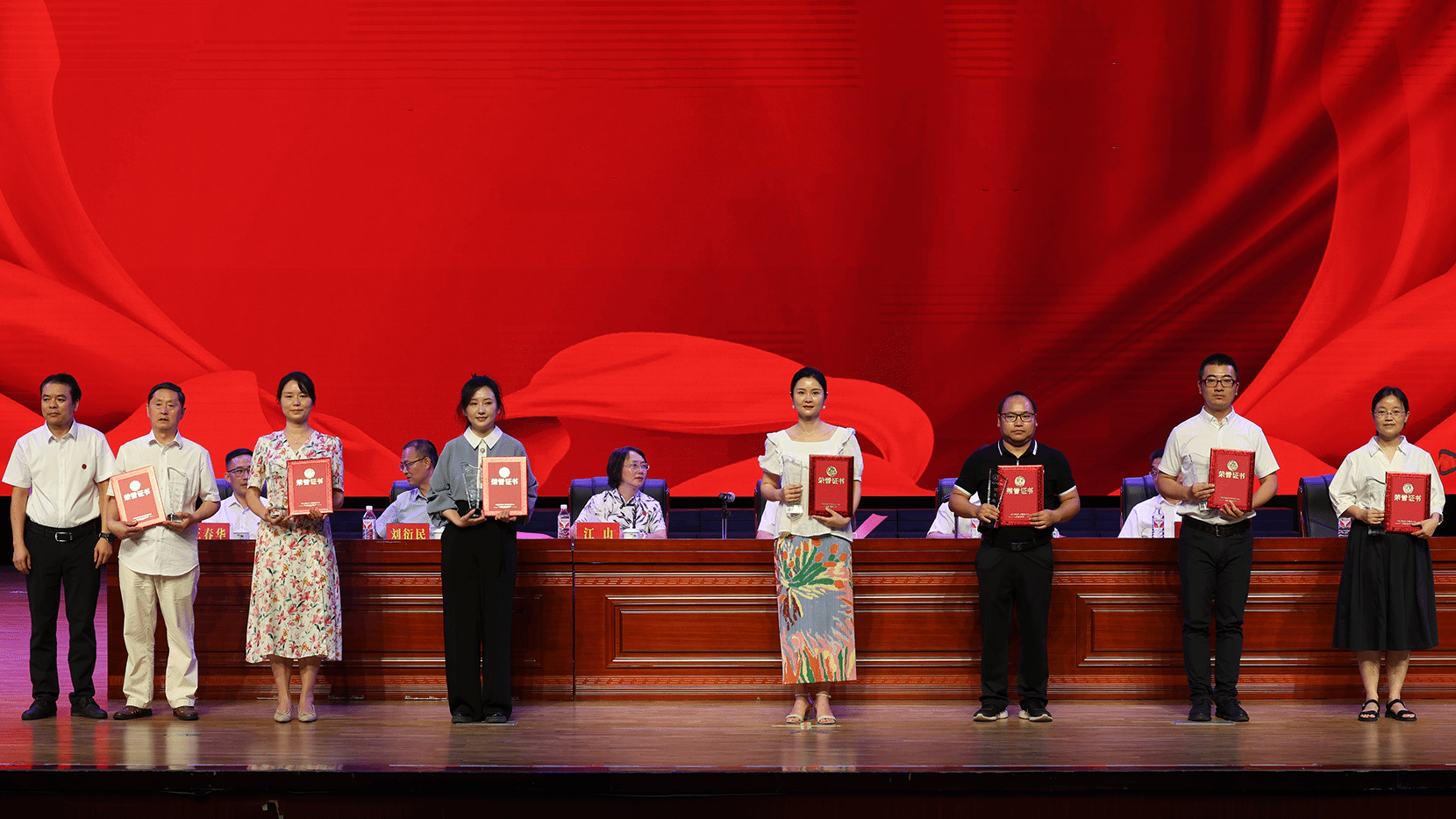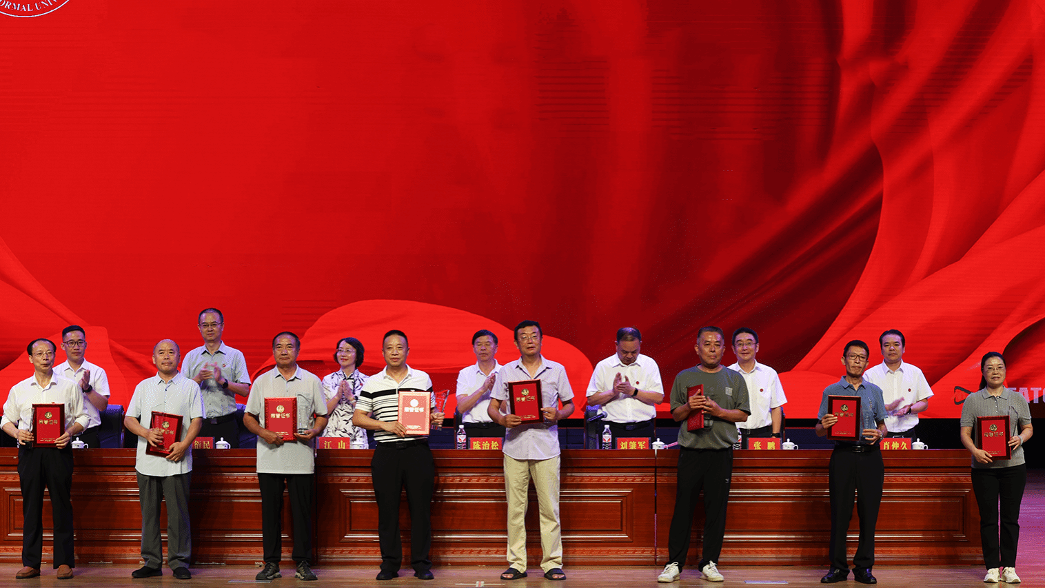 大会宣读荣誉退休教师名单,主席台就座领导为2024年荣誉退休教师颁奖。