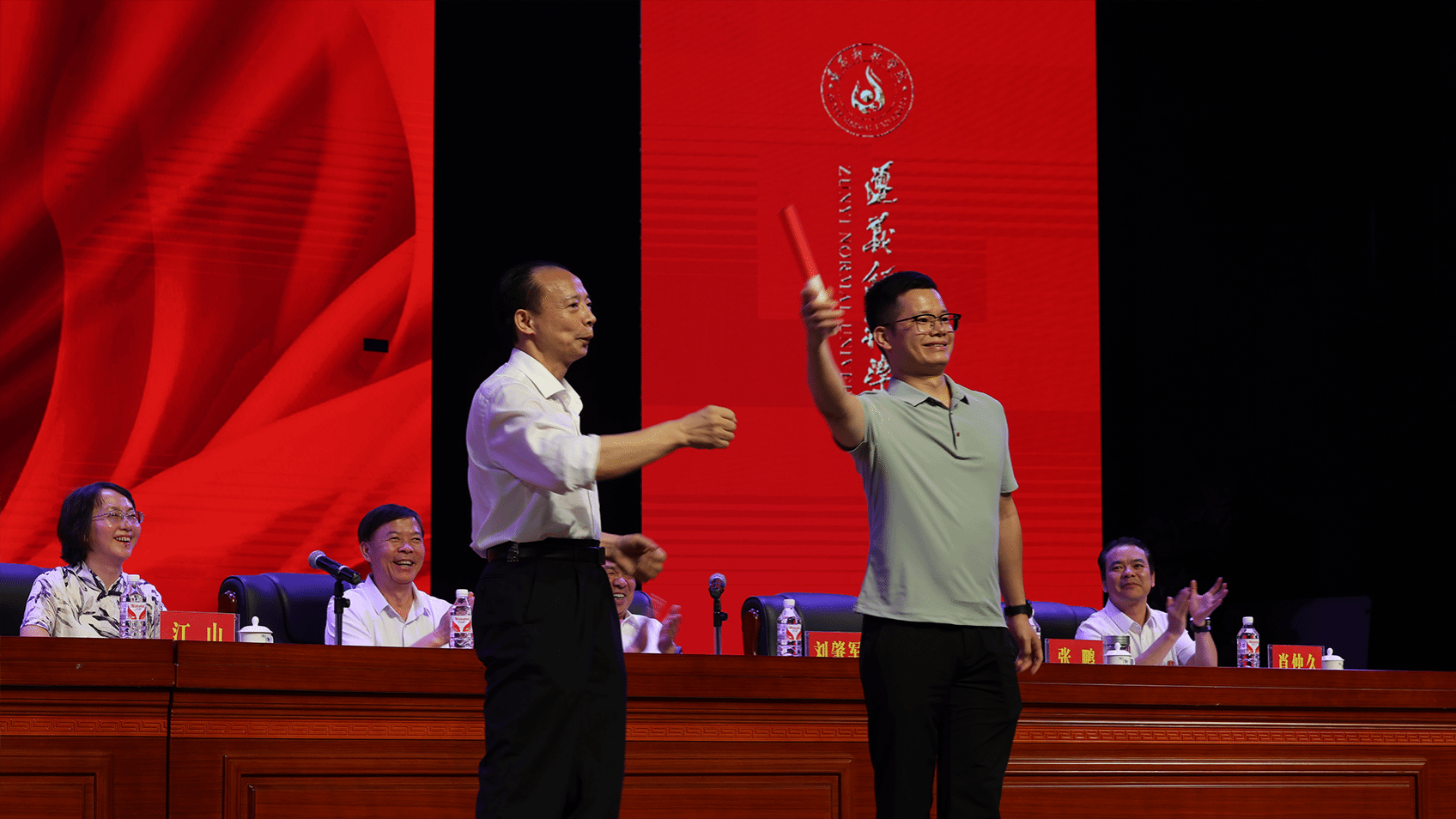 新教师代表、工学院博士教师罗朋从张少华手中接过教师接力棒,将教育梦想延续。