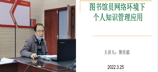 2022年3月25日,图书馆在314会议室举办了主题为“图书馆员网络环境下个人知识管理应用”的专业培训讲座,由流通部熊传毅老师主讲。