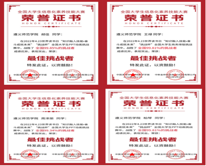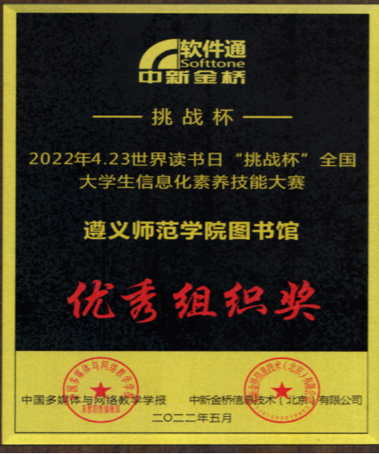 beat365亚洲版官网图书馆在第27个“4·23”世界读书日阅读推广活动中,联合中新金桥信息技术(北京)有限公司于2022年4月18日—5月10日举办“挑战杯”全国大学生信息素养技能大赛,现活动已圆满结束,按照“竞赛规则”(每个主题挑战赛前50名颁发荣誉证书),最终beat365数学学院胡佳、历史文化与旅游学院柏琴、管理学院周泽丽、外国语学院王禄4名同学获“最佳挑战者”荣誉称号,我馆获得优秀组织奖。
