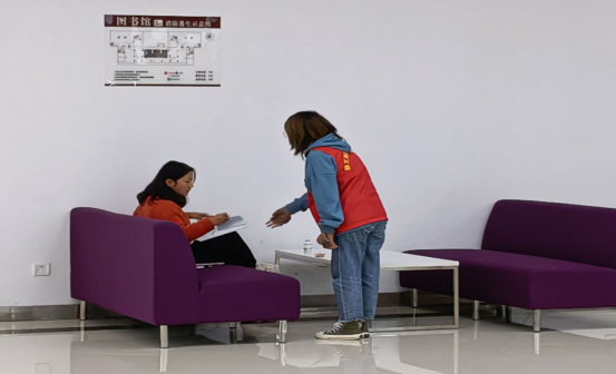 志愿者们不忘生命至上初心,牢记疫情防控使命,精心安排,统一部署,全力做好疫情防控工作。每天上午、中午和晚上三个时间段,均有16名志愿者按时到图书馆协助工作人员开展巡查,积极宣传、引导同学们做好个人防护。其中1名监督员随时到各楼层监督,检查志愿者工作情况及其纰漏, 履行监管责任,确保防控工作的持续进行;2人在图书馆入口处协助安保人员检查入馆人员的健康码、行程码及座位预约信息,精准掌握图书馆出入人员健康情况。其余13人则分配到各楼层, 及时提醒同学正确佩戴口罩,保持安全距离,严格隔空就座,坚决做到一座一人,防止人员聚集。