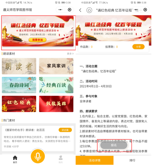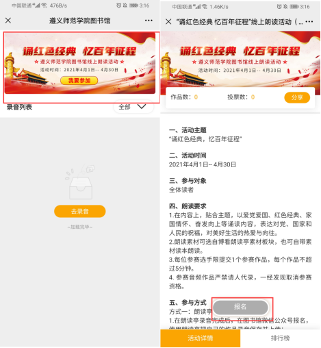 3.点击上方首页顶部活动轮播图,填写报名信息并提交已完成的朗读作品。