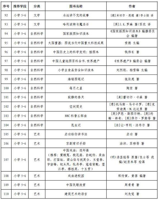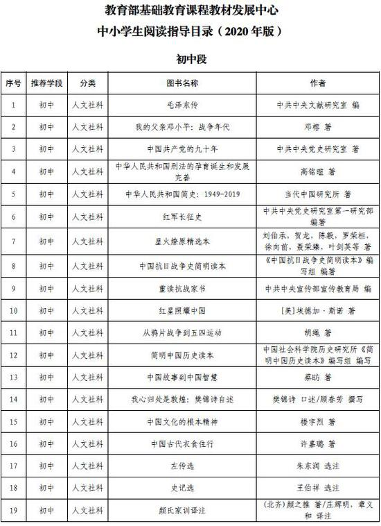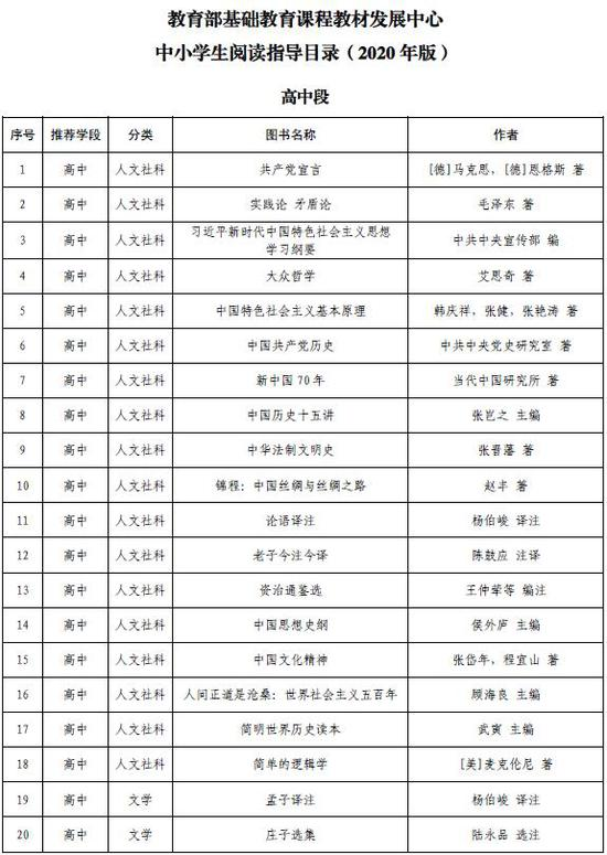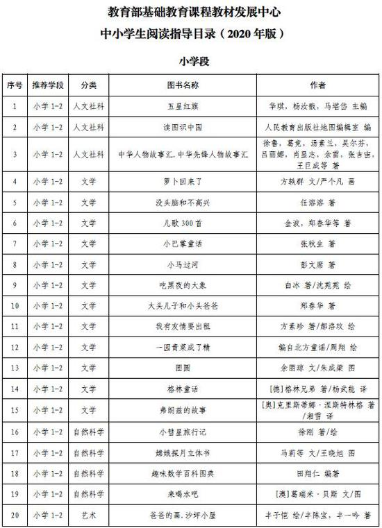 《教育部基础教育课程教材发展中心中小学生阅读指导目录(2020年版)》是受教育部委托,由教育部基础教育课程教材发展中心组织研制并发布。据悉,该目录研制历时一年,来自国家教材委、有关高校、研究机构和中小学校的110多人的专家团队,经过基础研究、专业推荐、深入论证多个环节,根据青少年儿童不同时期的心智发展水平、认知理解能力和阅读特点,从古今中外浩如烟海的图书中精心遴选出300种图书。该目录分为小学、初中、高中三个学段,其中小学110种、初中100种、高中90种。所列书目分为人文社科、文学、自然科学和艺术四类,充分体现德智体美劳全面培养的目标。以后还将根据经济社会发展需要对《指导目录》进行动态调整,不断完善更新。