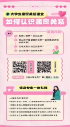 为助力大学生完成这一人生必修课,图书馆将在第29个世界读书日为大家带来《大学生亲密关系课堂系列讲座》,带领同学们一起解读《大学生亲密关系调研报告》;认识亲密关系,应对亲密关系危险信号;了解建立和维护亲密关系的原则;学习培养优质亲密关系的关键心理技巧等。讲座第一讲将于4月11日19:00点正式开启,期待你的参与!