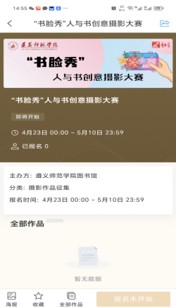 (3)点击“书脸秀”轮播图或应用参与活动,点击立即报名参与活动并上传作品。报名时需严格按照要求填写个人信息,便于后期作品相关信息数据的统计、整理以及活动奖品的发放。