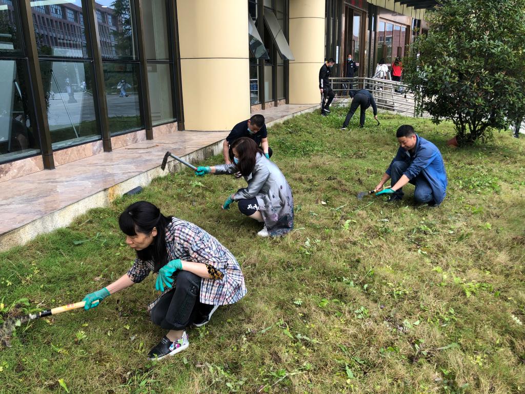 虽然晚上刚下过雨,地上还比较湿,杂草也比较多,但大家不怕脏、不怕累,分工协作,井然有序,干劲十足。经过大家的努力,图书馆周边的面貌焕然一新。