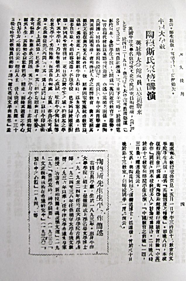 4月30日下午三点,丁字口附近座无虚席的播声电影院里,陶德斯教授向浙大全体学生作演讲。首先由梅光迪代校长这个中国首位留美文学博士用流利的英语、以申述中英关系为主旨致欢迎辞。接着,陶德斯教授发表题为“英国近代教育之趋势”的演讲。担任现场翻译的则是国文系主任郭斌龢教授。陶德斯结合自己三十年的经历,追溯文艺复兴直至希腊文化,对英国治人和治于人的两种教育模式进行了鞭辟入里的分析。最后,他提出三个问题:其一是上课问题,即阅读与笔记的关系;其二是研究专题与君子修养应齐头并进的问题;其三是学习的中心问题。他强调学习的中心“非为物质而为人生,其趋势必以社会科学之精进,而获其适当之中心当为努力之鹄的。”他的演讲发人深省,颇受欢迎。
