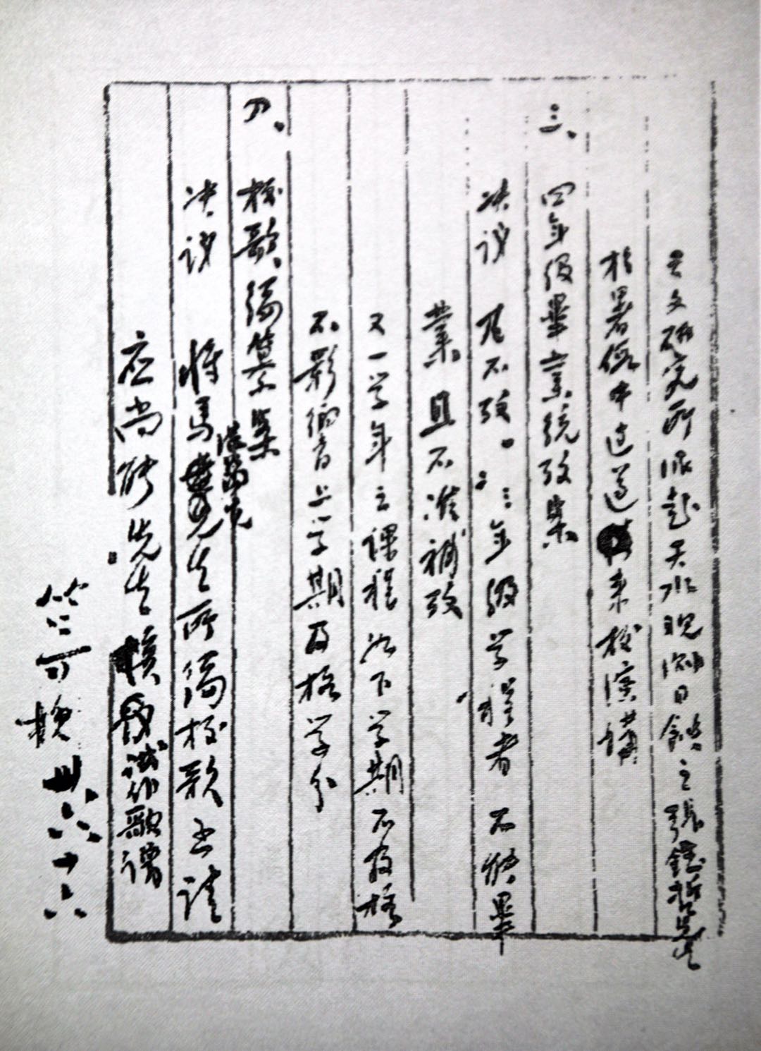 1941年6月14日下午四点,竺可桢校长在遵义新城何家巷总办公室主持召开第一百次行政谈话会。参加者有教务长张绍忠、工学院院长李熙谋、师范学院院长王琎、农学院院长蔡邦华(李相勖代)、史地系主任张其昀(诸葛麒代)。经过讨论,大家感觉马一浮的歌词虽文理艰深,但含义深远,切合浙大的办学精神。于是,会议议定:“将马湛翁(即马一浮——引者注)先生所编校歌歌词函请应尚能先生试作歌谱。”时隔两天,竺校长在竺士楷所做的会议记录上签名认可。十天后,竺校长致函远在上海的应尚能,并随函附上校歌歌词。