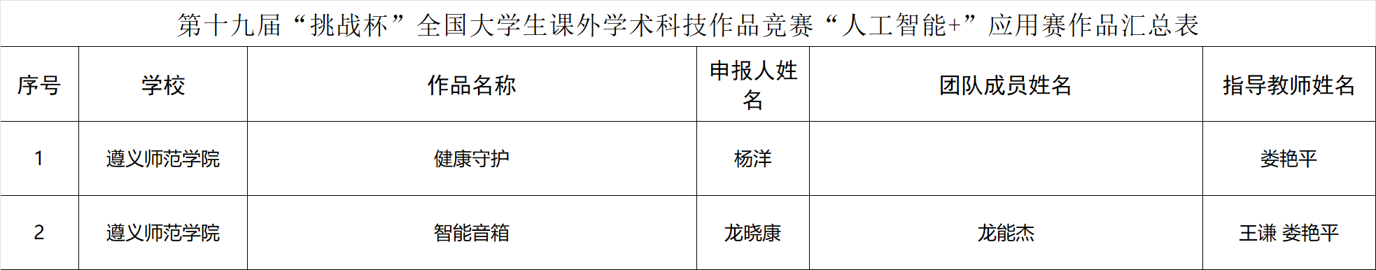 根据第十九届“挑战杯”“人工智能+”专项赛作品申报工作有关要求,现已完成第十九届“挑战杯”“人工智能+”专项赛作品申报推荐工作,现将结果公示。如有异议请于有效公示期内(2025年7月14日至2025年7月18日)到校团委科技实践部反映。