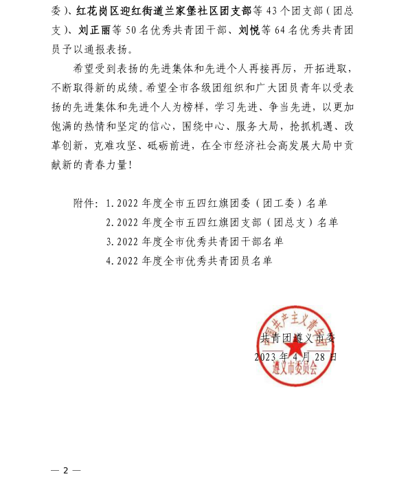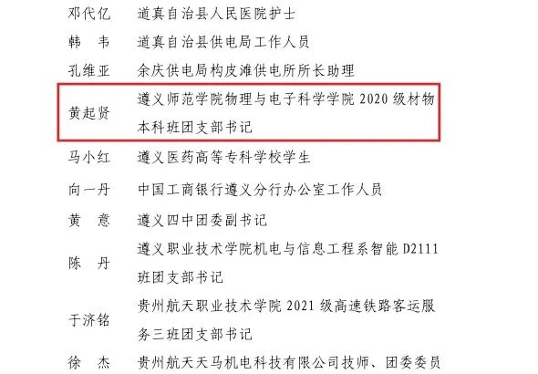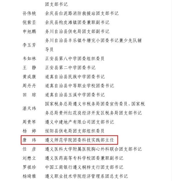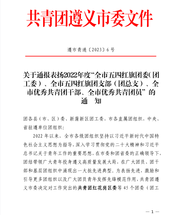 五四青年节前夕,共青团遵义市委印发了《关于通报表扬2022年度“全市五四红旗团委(团工委)、全市五四红旗团支部(团总支)、全市优秀共青团干部、全市优秀共青团员”的通知》(遵市青通〔2023〕6号)。beat365外国语学院团总支获“全市五四红旗团支部(团总支)”荣誉称号;beat365团委科技实践部主任唐玮获“全市优秀共青团干部”荣誉称号;beat365物理与电子科学学院2020级材料本科班黄起贤同学获“全市优秀共青团员”荣誉称号。