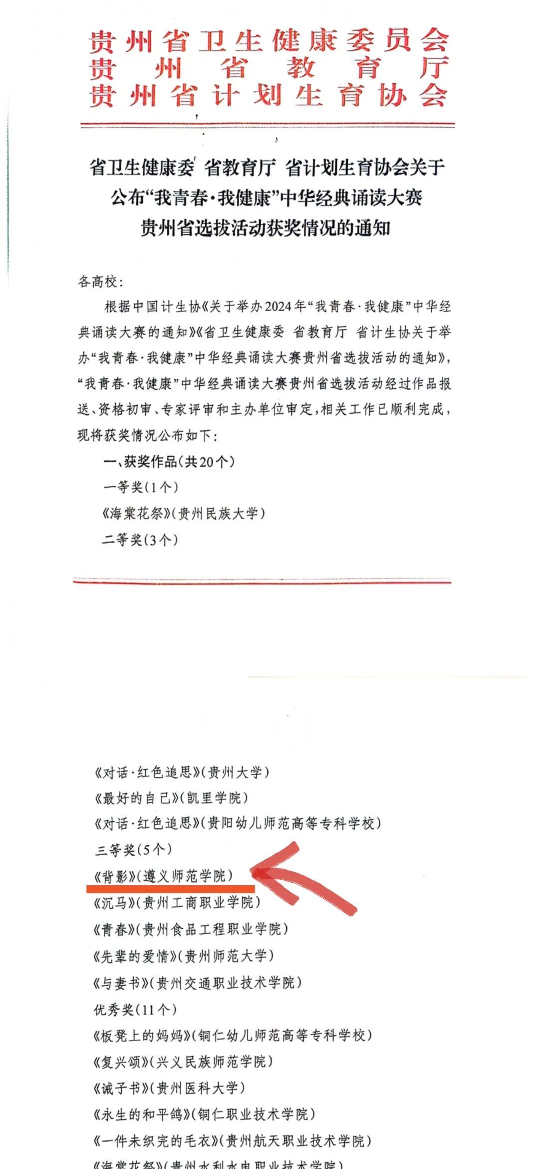 为鼓励青少年诵读中华经典和红色经典中有关“爱情、友情、亲情”的相关内容,引导青少年正确理解友谊、爱情、婚姻对人生的意义,省卫生健康委、省教育厅、省计划生育协会举办了“我青春·我健康”中华经典诵读大赛。在校团委的组织下,由田伟力老师指导,人文与传媒学院朱兆麟、王钦宇、刘林三位同学演绎的朗诵作品《背影》在比赛中获得省级三等奖,beat365亚洲版官网获得“优秀组织单位”。(文/校团委 图/校团委)