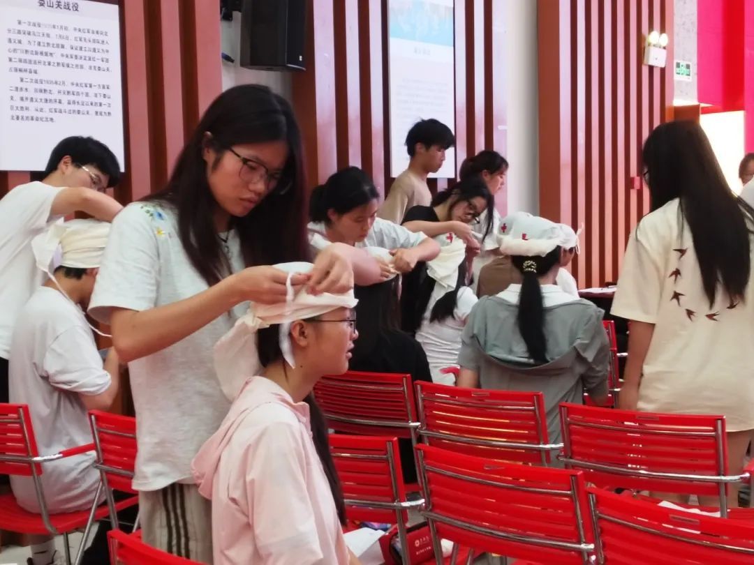 参训学生认真聆听讲解,详细记录急救要点。在龚老师的专业指导下,学员们分组进行实操训练,重点反复练习了创伤包扎等技能,注重操作手法的准确性与熟练度,切实将理论知识转化为实际应用能力。