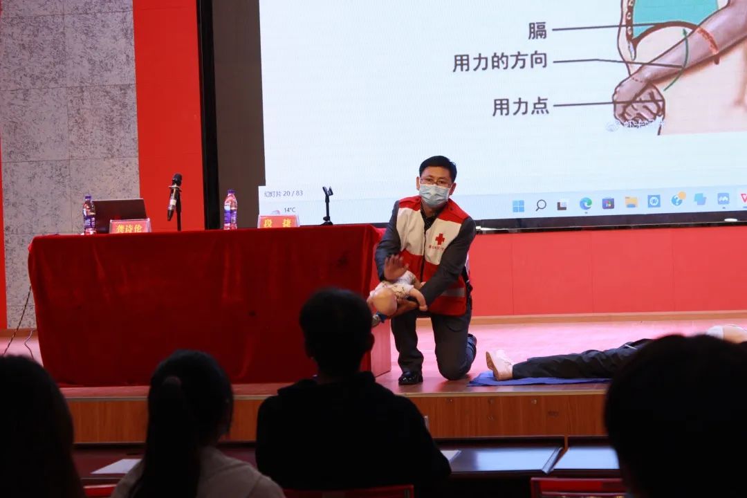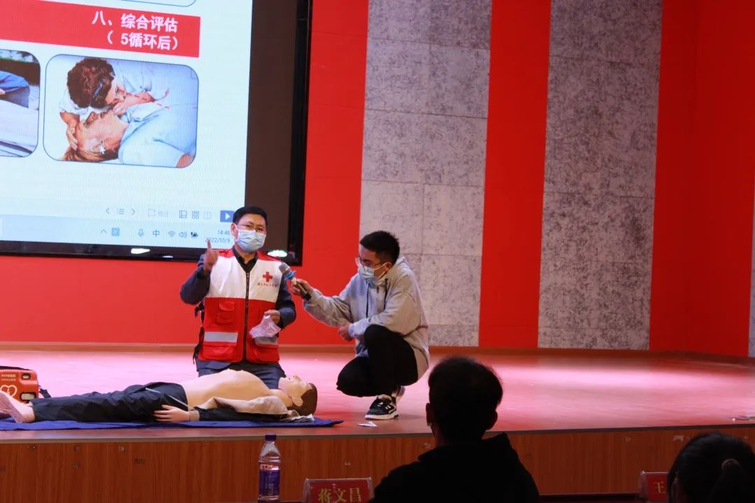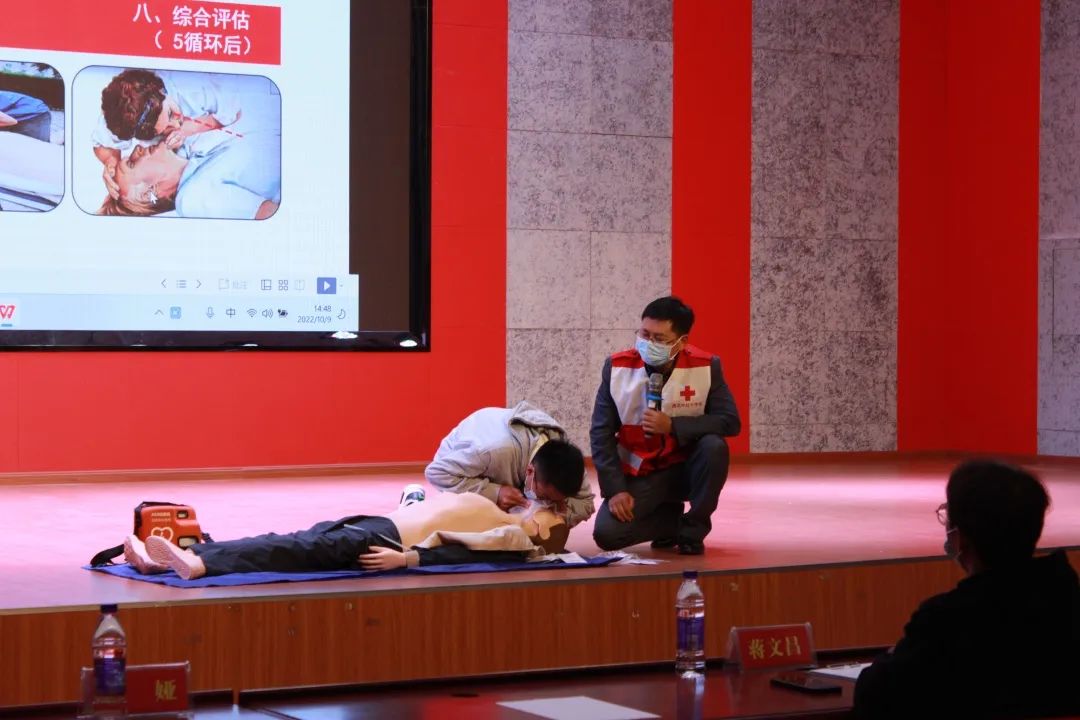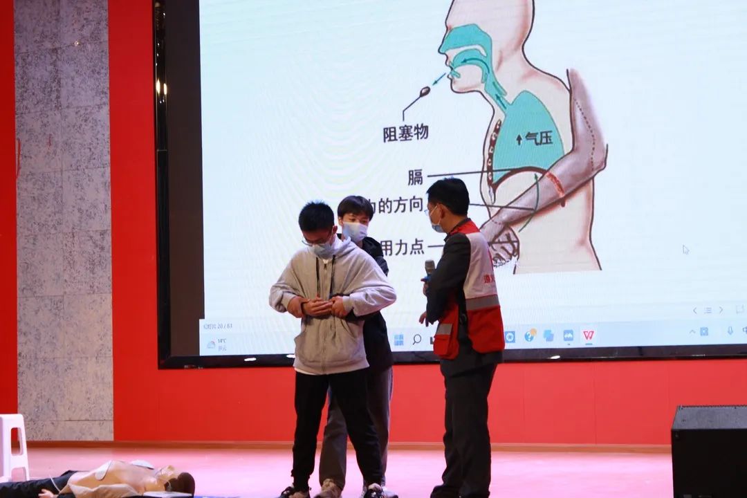 培训老师们在线下带领现场配合实操的30多名同学进行应急救护模拟展示,其余师生通过腾讯会议直播进行学习。通过培训师细致生动的讲解,同学们对判断人是否丧失意识、有无自主呼吸、胸外心脏按压、清理口腔异物等操作方法,以及按压手势、位置和力度的要领等都进行了深入的学习。培训过程中,线下配合实操的同学积极与培训师互动,踊跃参与实操练习,线上参与的同学认真聆听,充分认识了何为急救和如何急救。