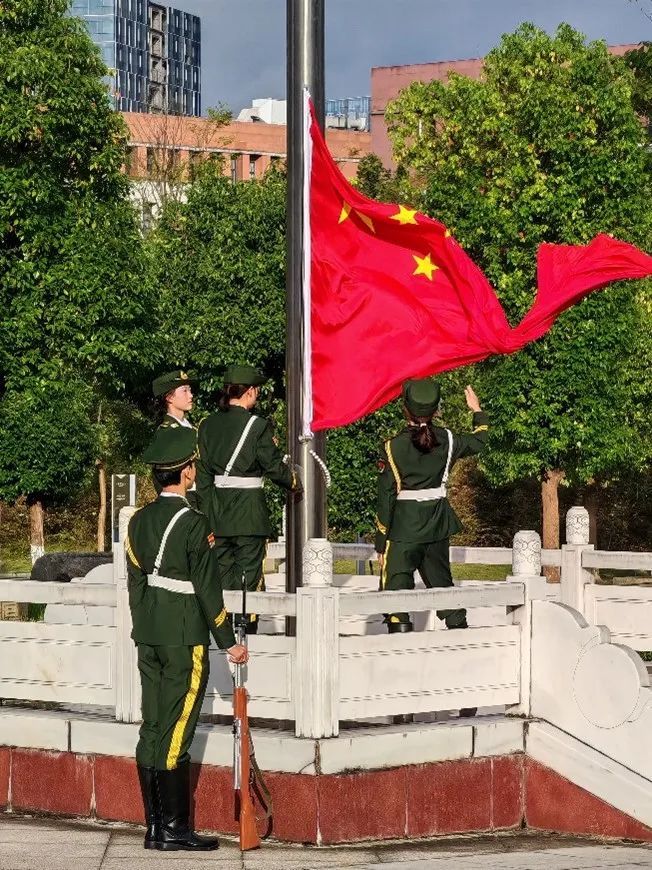 升旗仪式开始,护旗方队仪态庄重、步伐整齐,护送国旗向升旗台走来,随着五星红旗缓缓升起,全场齐唱《义勇军进行曲》。