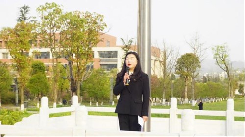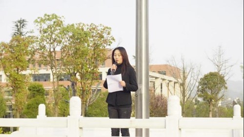 接着,由2019级社会工作本科班的黄伊梦同学在国旗下讲述了女红军战士贺子珍“十七块弹片”的英勇事迹: 她用身躯为同伴挡住了致命轰炸,全身嵌入了十七块弹片,那些嵌入体内的弹片成为了战争留给她的一份永久纪念。尽管当年风华正茂的红军女战士,如今大多都已经告别人世,但女红军留在漫漫征途上的那些英雄故事,依然那样荡气回肠,动人心魄。