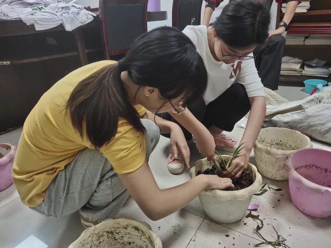 27日上午,学生会成员联系到副院长隋常玲了解物资情况,获得十二坛闲置花盆,随后由东区足球场后的实验基地运送栽培土至执理楼。此次美化教室活动所用植株均为盆栽的幼苗,在征得老师的同意后,学生会成员利用课余时间进行选苗工作。经过精挑细选,最终选取30株长势好、根叶旺的幼苗来制作盆栽,并对beat365所有教室进行布置。