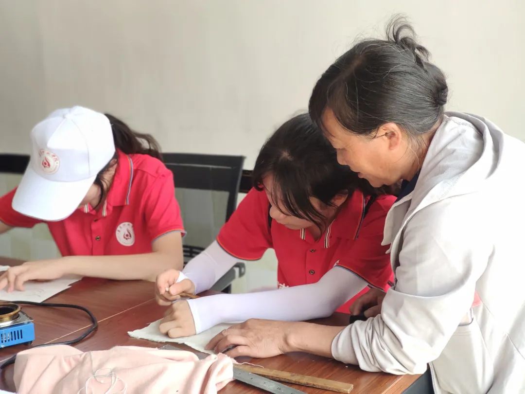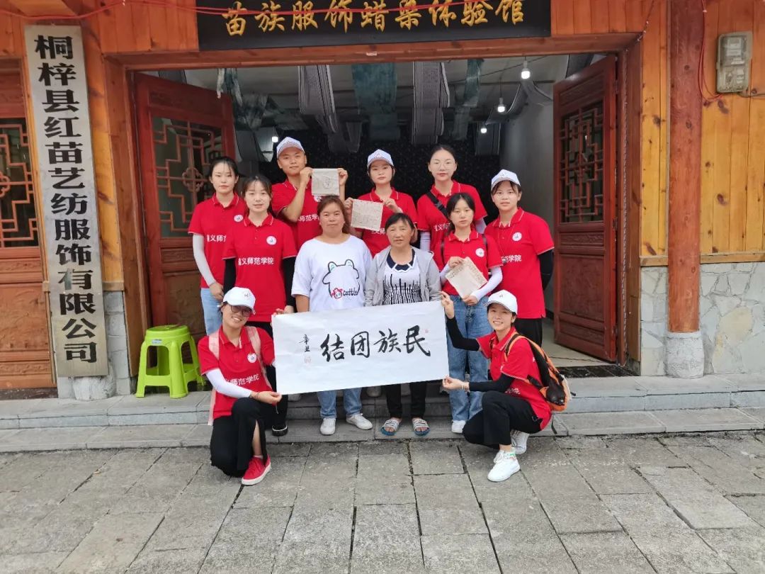 在这里,我们得到了当地村民的友好礼待和帮助,也为他们宣讲了红色英雄人物的事迹,将红色精神在此发扬传播;在这里,我们跟当地居民相处融洽,感受到了苗族阿哥、阿妹的多才多艺和热情昂扬;在这里,我们学习了蜡染和扎染的传统手工工艺,同学们都纷纷拿起蜡刀在棉麻布上描摹独一无二的蜡染图案,亦或用线扎起白布再放进草药调制的染缸里,最后制成一副扎染图;在这里,我们欣赏了苗绣传承人们堪称美轮美奂的刺绣过程,以及一个个精美的苗绣成品;在这里,随处可见“苗汉一家,共创辉煌”的标语,让我们切身处在苗汉一家亲,民族大团结的氛围之中,感受到了苗汉情深。