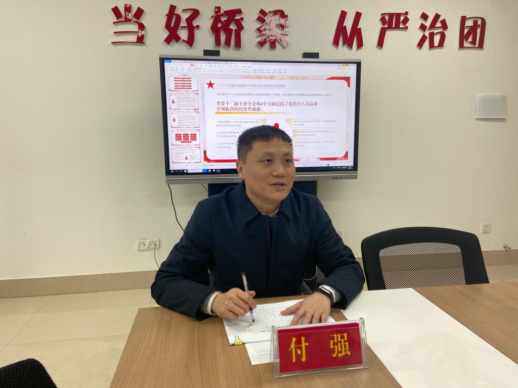 付强同志的宣讲从《决议》生成的历史背景及其必要性、《决议》体现的新思想和新论断、深刻把握决议精神,奋力开创百姓富、生态美的多彩贵州新未来和积蓄奋斗磅礴力量,推进遵师共青团工作创新绩四个方面展开。宣讲既有理论深度,又有生动案例;既有学习体会,又有深入思考;既有历史视野,又有现实要求。通过付强同志的宣讲让支部的每位党员都深刻领悟“两个确立”,始终做到“两个维护”,不仅要体现在履职尽责、做好本职工作的实际效果上,更要体现在党员、干部的日常言行上。
