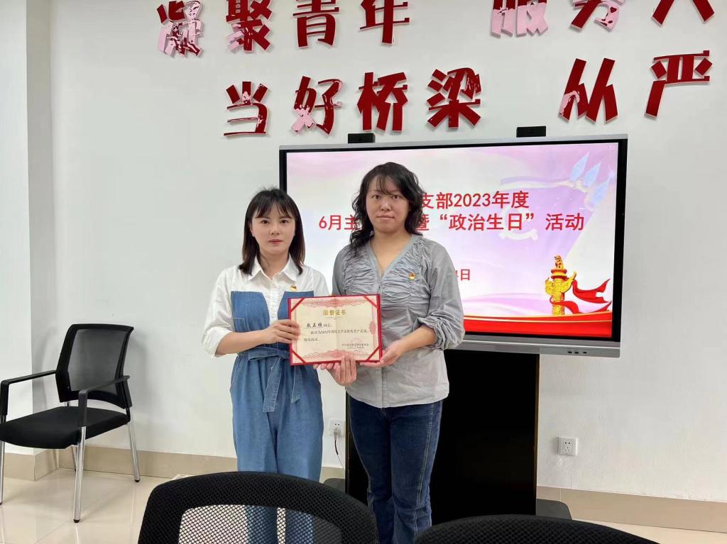 余睿同志为敖正雅同志颁发2022年度优秀共产党荣誉证书