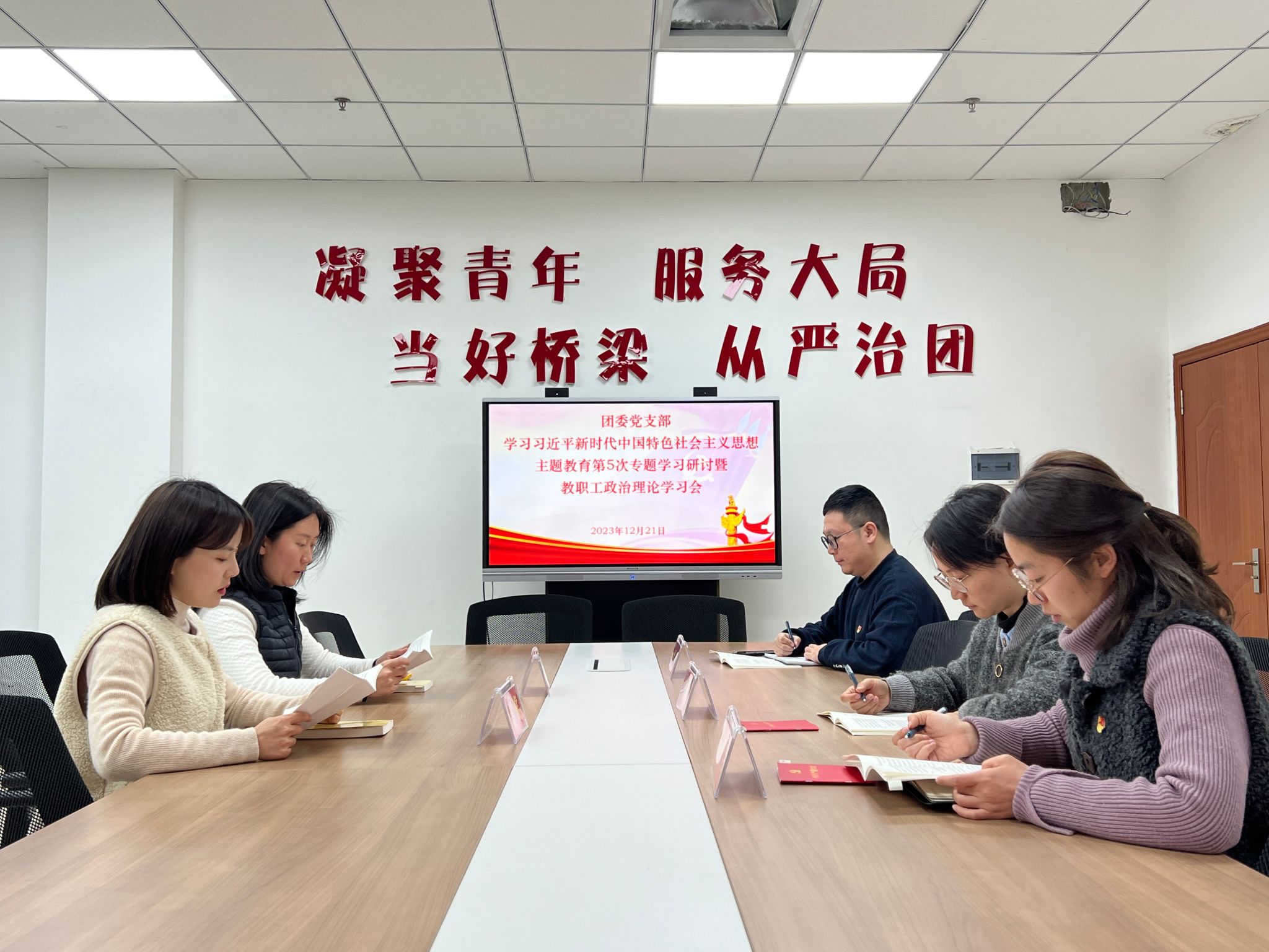 为落实学校党委宣传部关于第8期党员、教职工政治理论学习工作提示内容,团委党支部分别于2023年12月21日、28日召开学习贯彻习近平新时代中国特色社会主义思想主题教育第5次专题学习研讨暨教职工政治理论学习会和学习贯彻习近平新时代中国特色社会主义思想主题教育第6次专题学习研讨暨教职工政治理论学习会。