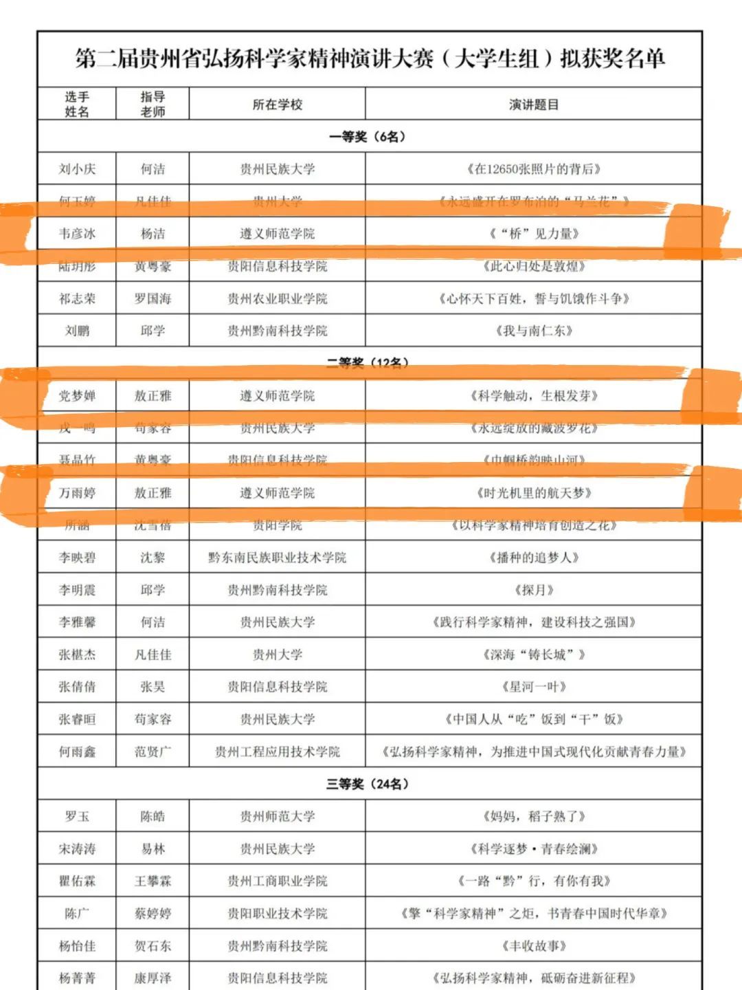 再次祝贺以上同学在本次第二届贵州省弘扬科学家精神演讲大赛(大学生组)中取得了优异的成绩,相信在未来的舞台上,遵师学子将继续在各项比赛中散发光彩!(图文 | 遵师青年 排版 | 吴佳若 初审 | 吴佳若 复审 | 敖正雅 终审 | 余睿 李瑾)