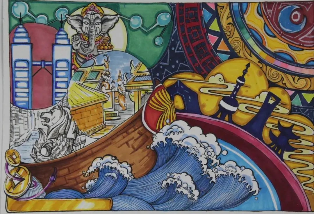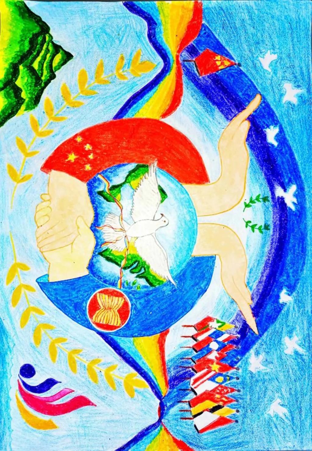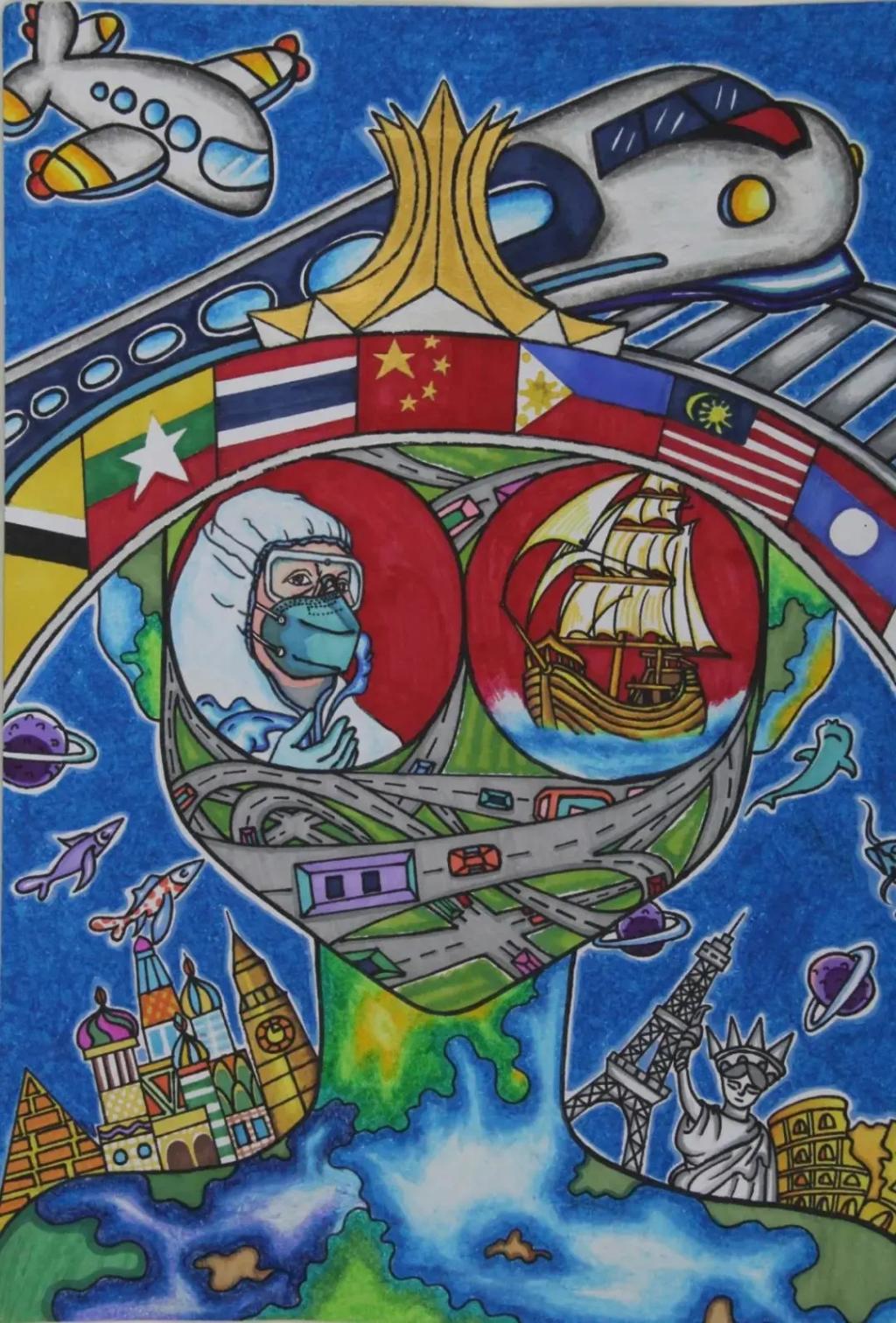 beat365选送的作品内容都紧扣我国与东盟国家同舟共济、共克时艰,携手抗击新冠肺炎疫情这一主题,一幅幅绘画作品别出心裁、夺人眼球,充分表达了中国与东盟青年的深厚情谊。同学们以画纸为纽带,画出我国与东盟国家的美丽蓝图;以画笔为依托,勾勒出我国与东盟国家的壮阔未来;以画作为信物,促进了中国与东盟青年文化艺术的交流与合作。下面,小编带大家一起欣赏优秀画作吧!