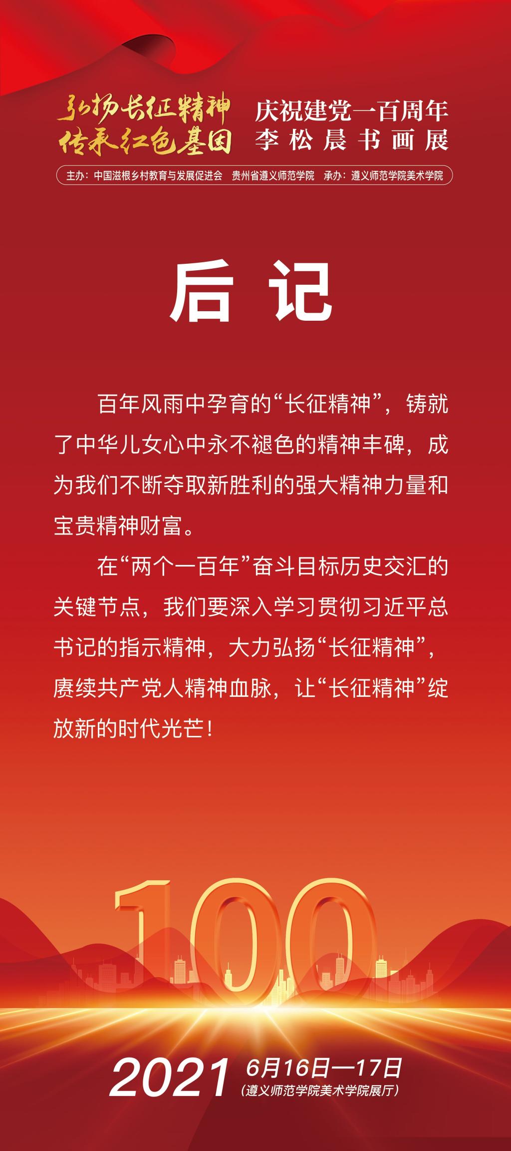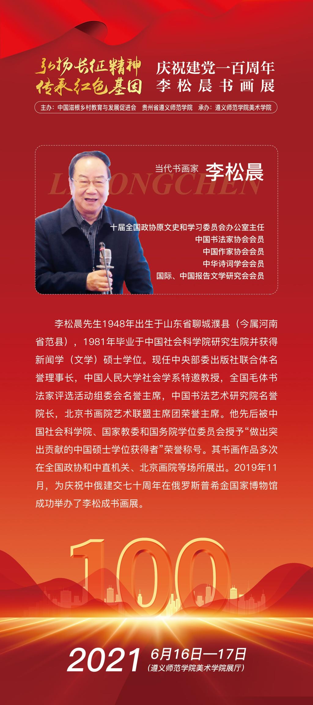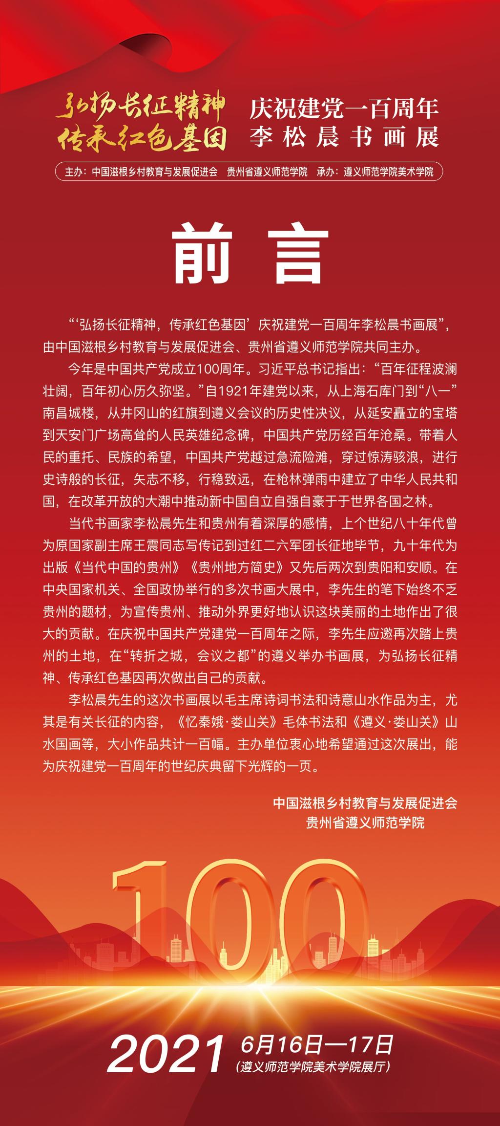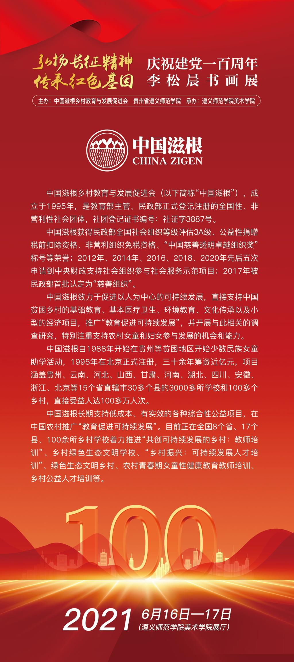 由中国滋根乡村教育与发展促进会、贵州省beat365亚洲版官网主办的“‘弘扬长征精神,传承红色基因’ 庆祝建党一百周年李松晨书画展”,将于6月16日至17日在beat365亚洲版官网隆重举行。