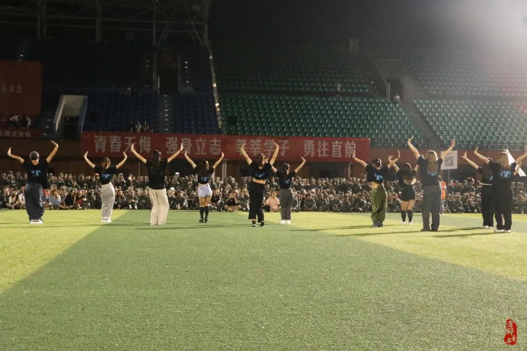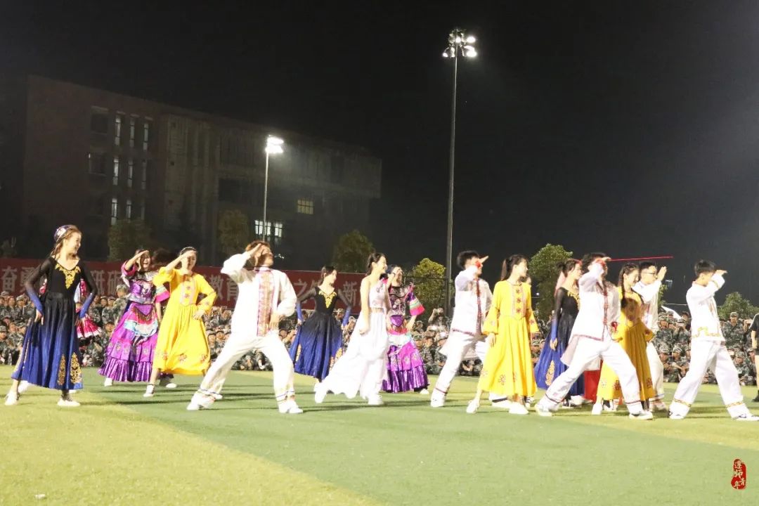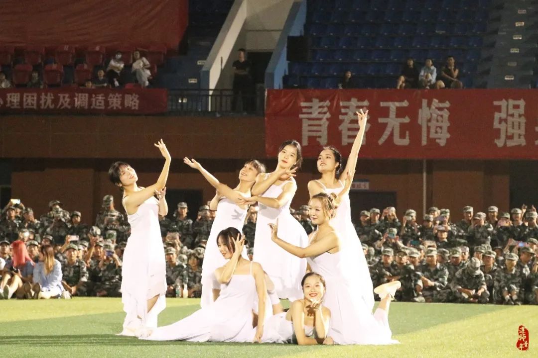 广阔的绿茵场中央,学长学姐们自信洋溢地的展示beat365学子风采,彰显青春活力。爵士舞开场“点燃”全场,古典舞在晚风里携来清凉,歌舞串烧将节目推向高潮,吉他弹唱带领全场摇曳星光……遵师军训的夜晚,因为每颗青春的心跳而变得绚丽多彩。