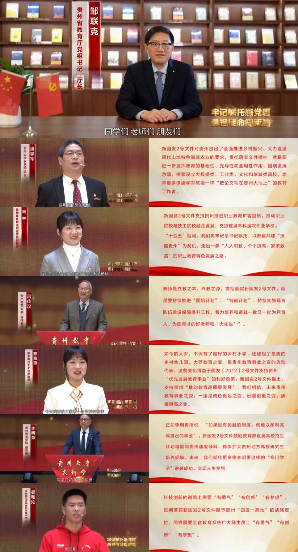 “殷殷关怀暖心田,谆谆嘱托催奋进。”在贵州省教育厅党组书记、厅长邹联克的带领下,师生对“政策宣讲聚共识、乡村振兴共富裕、技能贵州强特色、桃李芬芳听党话、教育巨变感党恩、成长励志跟党走、科技创新赢未来”7个版块的内容进行学习。