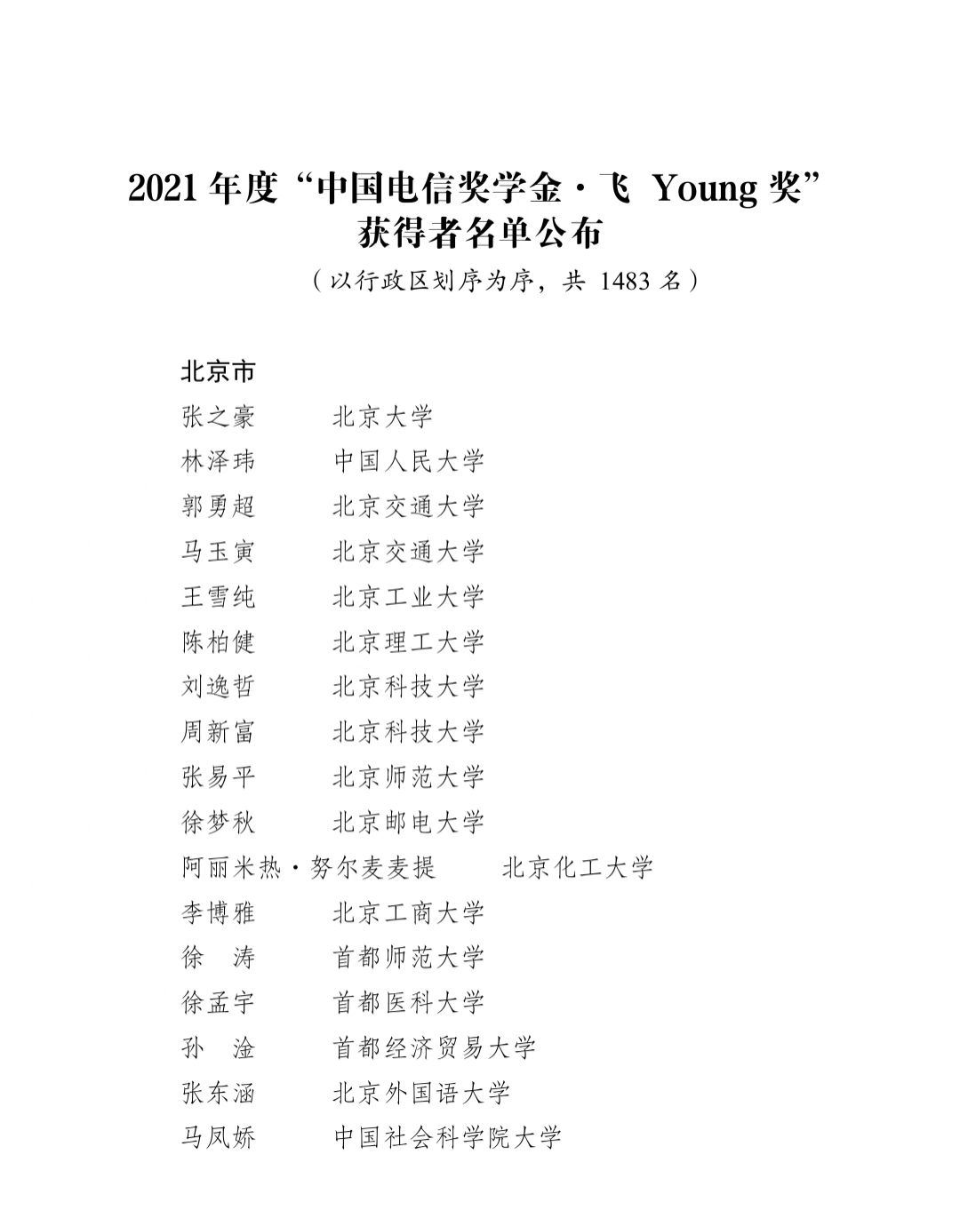 近日,由共青团中央、全国学联指导、中国电信集团有限公司、中国光华科技基金会联合举办的2021年度“中国电信奖学金”评选活动落下帷幕,beat365王光武同学荣获2021年度“中国电信奖学金·飞Young奖”。
