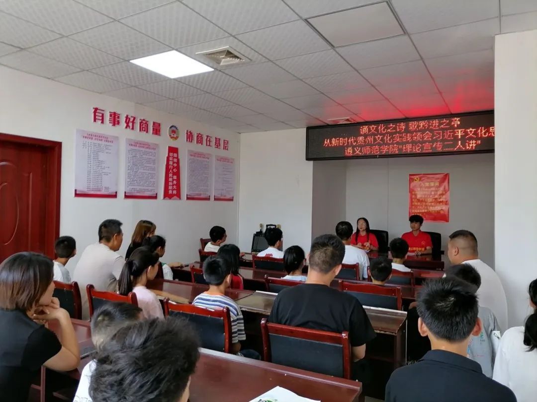 “三下乡”期间,实践队把红色文化与贵州文化、贵州脱贫攻坚实践、贵州“富矿精开”战略相结合,开展了一场别开生面的“理论宣传二人讲”活动。活动以“诵文化之诗 歌前进之章 从新时代贵州文化实践领会习近平文化思想”为主题。