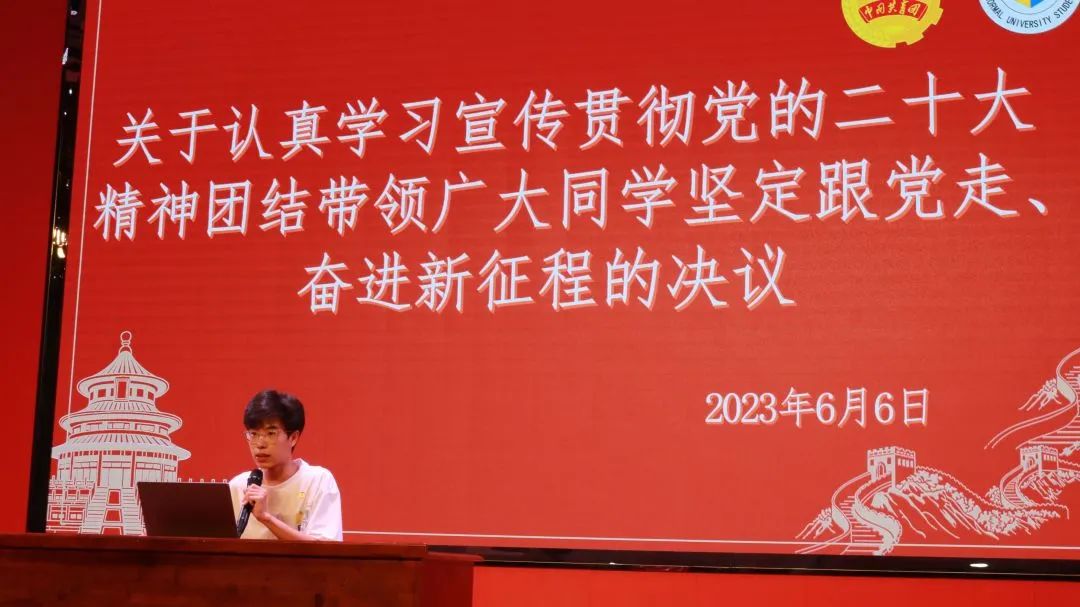 最后,权益部部长熊坤刚向全体成员传达了《中华全国学生联合会委员会、主席团工作规则(试行)》《关于认真学习宣传贯彻党的二十大精神团结带领广大同学坚定跟党走、奋进新征程的决议》《在全国学联第二十七届委员会第二次全体会议上的工作报告》《认真学习宣传贯彻党的二十大精神团结带领广大同学坚定跟党走、奋进新征程》等文件精神,激励大家勇担时代重任,矢志奉献人民,在建设社会主义现代化强国的伟大征程中贡献青年力量,放飞青春梦想。