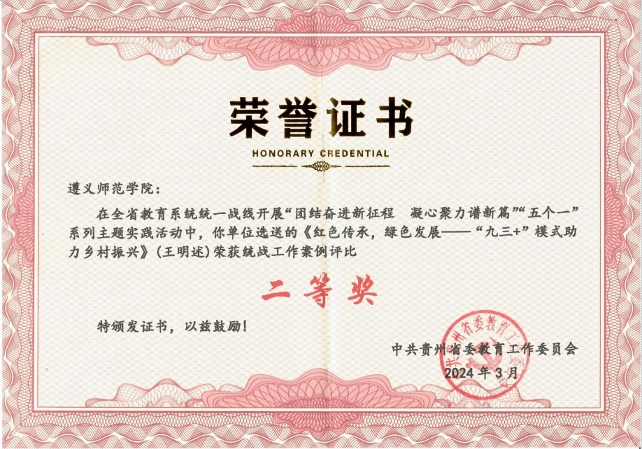 近日,省委教育工委在全省教育系统统一战线开展“团结奋进新征程 凝心聚力新篇章”“五个一”系列主题实践活动,beat365亚洲版官网党委统战部积极响应,精心组织,推荐报送的九三学社统战工作案例《红色传承,绿色发展——“九三+”模式助力乡村振兴》获统战工作案例评比二等奖。